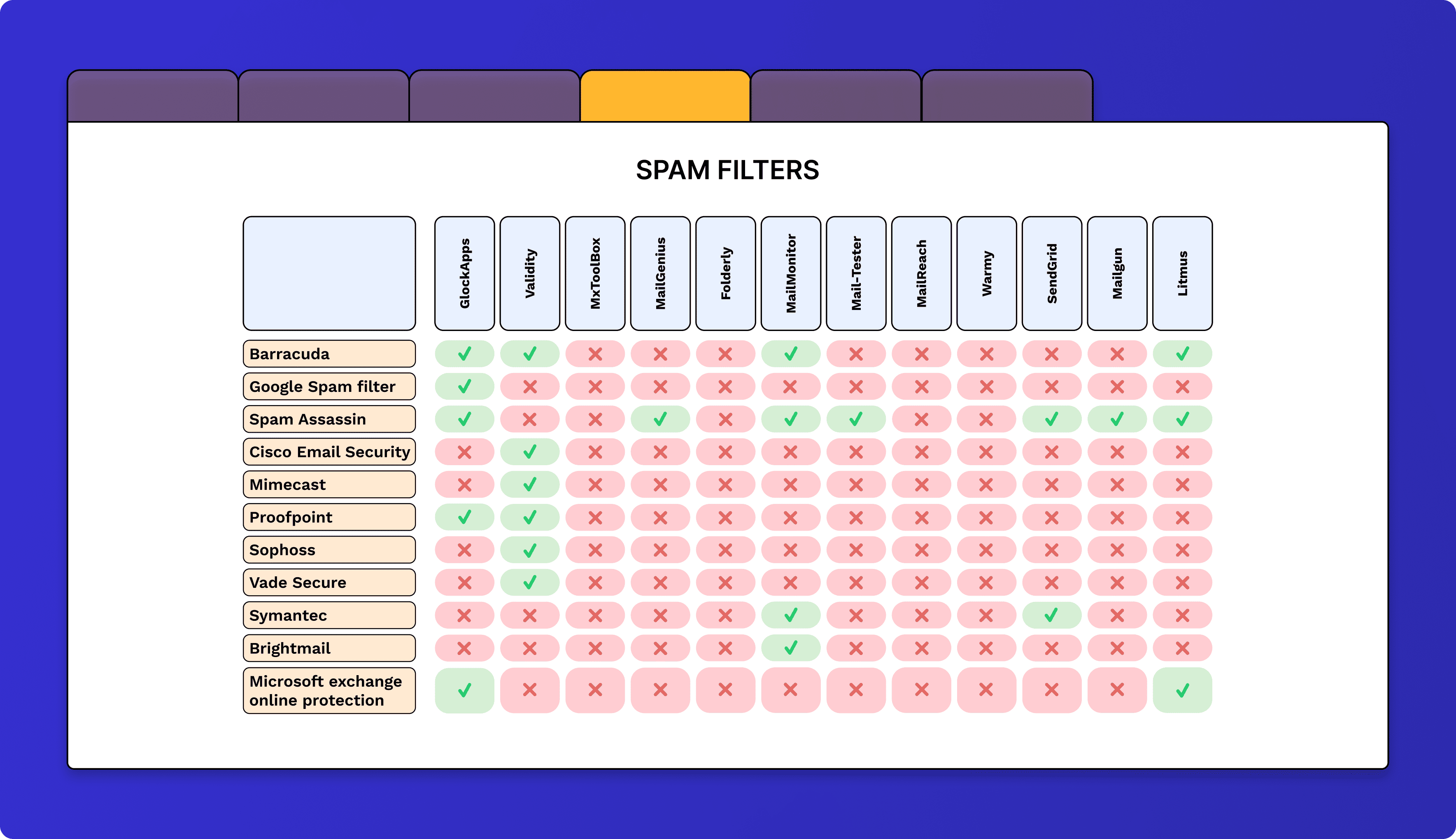 Me and my colleagues at GlockApps made your selection process simple and data-driven. Below I share our latest “Email Deliverability Tools Quality Analysis” to give you a detailed comparison of all the features of the top email spam testing services on the market.